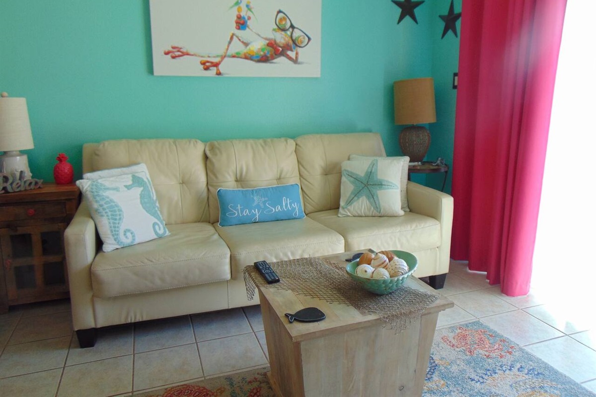1 Bedroom • 1 Bathroom 1 Bath • Sleeps 4-6Welcome to Salty Breeze - where the gulf breeze welcomes you to spend time on the balcony overlooking the heated pool and straight on to the BEACH! Preciously decorated and appointed with everything you could need to enjoy your Galveston Getaway. Come Stay With Us at Salty Breeze-a 1 bedroom 1 bath condo welcoming up to 6 guests including child appropriate twin bunks in the hallway alcove and a queen sleeper sofa in the living room. Comfy beds, equipped kitchen at the Victorian resort complex