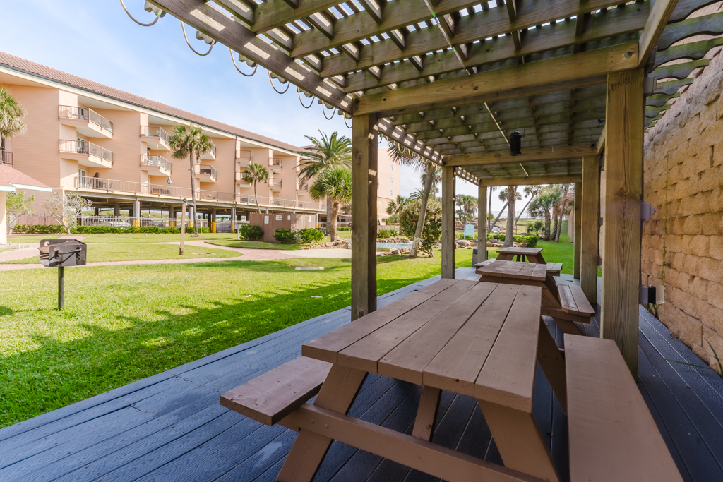 The spacious kitchen with everything – and we do mean EVERYTHING you could need from preparing gourmet meals to warming up leftovers from any of Galveston’s amazing restaurants (need suggestions – just ask, we’re happy to help!) from silverware to cookware, dishware to glassware, and a full suite of full-sized appliances. You can bring everything or pack light as this amazing condo includes its own washer/dryer, too! (A rare find in a condominium!) The kitchen opens to the living room with seating for all weather movie night or family game night, or just relaxing as you gaze out the sliding door to 1 of the two balconies that overlooks the tropical grounds of the complex. Or step out and enjoy your morning coffee or afternoon cocktail. If one of you HAS to cook – call the family in from the pool, or head down and use one of the grills around the pool area and have a picnic at the tables provided for guest use.